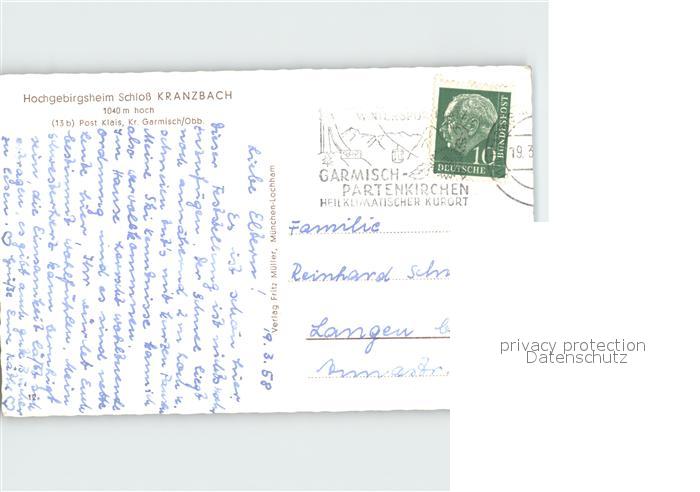 72299784 alte Postkarte Klais Hochgebirgsheim Schloss Kranzbach postalisch gelaufen Erhaltung siehe scans KatCode: 11110009180122