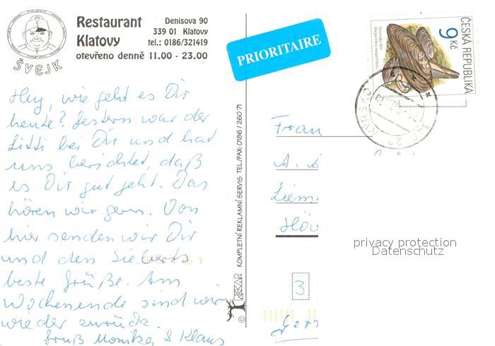 12983309 old postcard Klatovy Restaurant Klatovy postalisch gelaufen Erhaltung siehe scans [AndreD76] KatCode: 11520