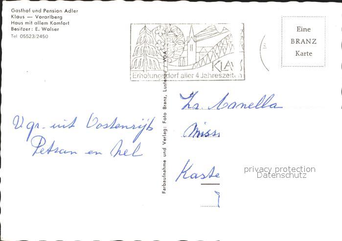 72270785 alte Postkarte Klaus Vorarlberg Gasthof Pension Adler Kirche postalisch gelaufen Erhaltung siehe scans KatCode: 11390342080409