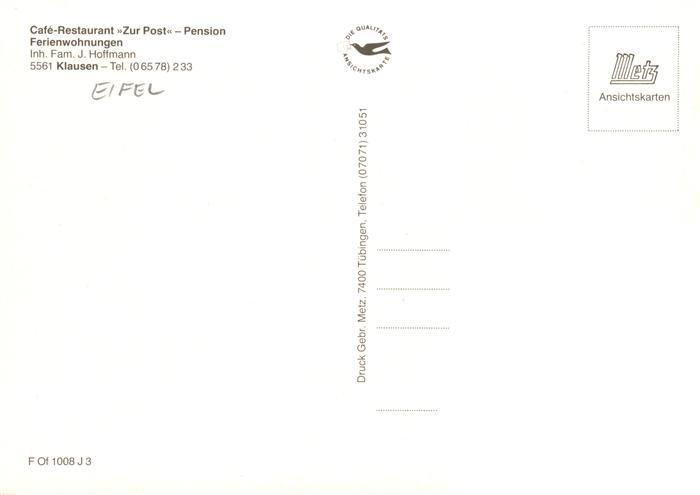 73881213 Klausen Clausen Eifel Cafe Restaurant Zur Post Pension Ferienwohnungen postalisch nicht gelaufen Erhaltung siehe scans [WerneD78] KatCode: 11110007231069