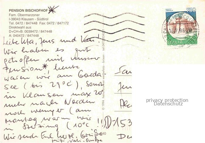 74039541 old postcard Klausen Eisacktal Suedtirol IT Pension Bischofhof postalisch gelaufen Erhaltung siehe scans [FriedD77] KatCode: 11240