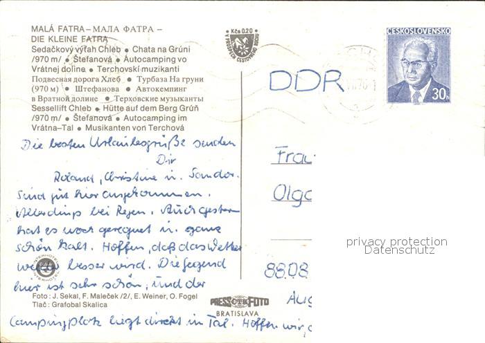 old postcard Kleine Fatra Camping Vratna Sedackovy vytah Chleb Chata Gruni postalisch gelaufen Erhaltung siehe scans