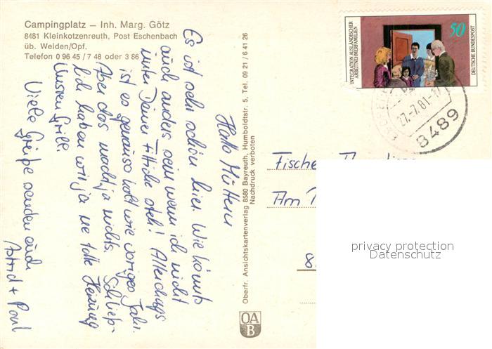 73643850 alte Postkarte Kleinkotzenreuth Oberpfalz Campingplatz Eschenbach Abendstimmung See Kloster Speinshart postalisch gelaufen Erhaltung siehe scans [FriedD77] KatCode: 11110009374117