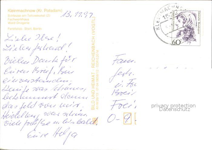 72322721 alte Postkarte Kleinmachnow Teltowkanal Schleuse Fachwerkhaus Wald Drogerie postalisch gelaufen Erhaltung siehe scans KatCode: 11110012069304
