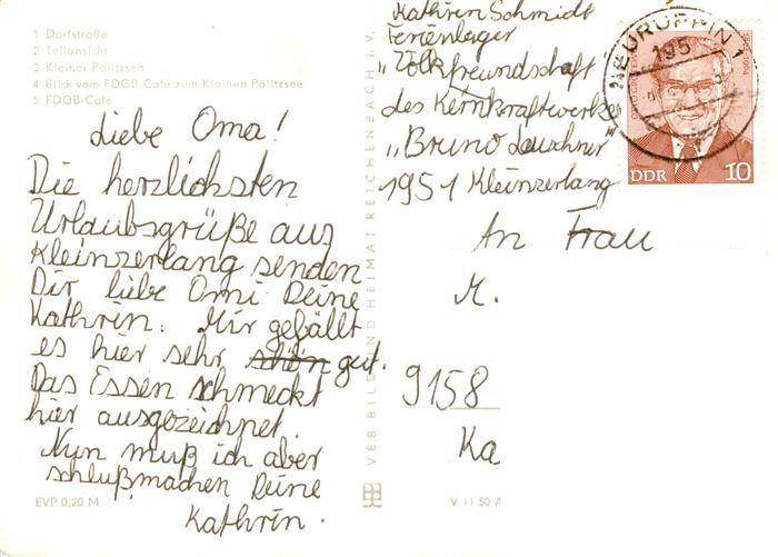 73902013 alte Postkarte Kleinzerlang Rheinsberg Dorfstrasse Teilansicht Kleiner Paelitzsee FDGB-Cafe postalisch gelaufen Erhaltung siehe scans [FriedD77] KatCode: 11110012068353