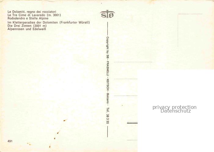 74021966 Klettern Bergsteigen Mountaineering Alpinisme Alpinismo– Dolomiten Drei Zinnen Alpenrosen Edelweiss postalisch nicht gelaufen Erhaltung siehe scans [SanaeD93] KatCode: 22520000005100