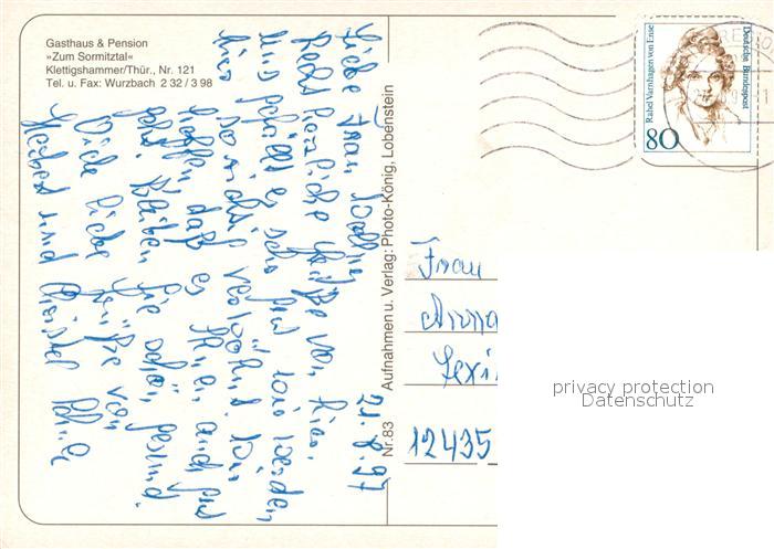 73651689 alte Postkarte Klettigshammer Gasthaus Pension Zum Sormitztal Restaurant Landschaftspanorama postalisch gelaufen Erhaltung siehe scans [FriedD77] KatCode: 11110016075133