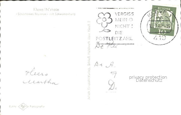 72081795 alte Postkarte Kleve Schuesterkes Brunnen mit Schwanenburg Wasserspiele postalisch gelaufen Erhaltung siehe scans KatCode: 11110005154036