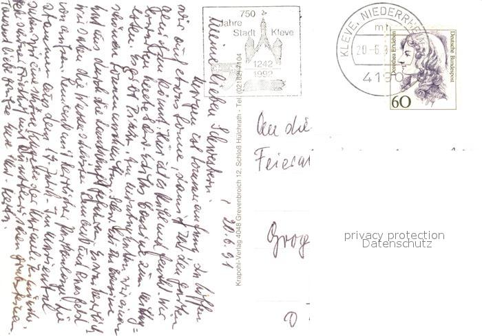 73071934 alte Postkarte Kleve Schwanenburg Amphitheater Denkmal Der Grosse Kurfuerst Kirche Rheinbruecke Brunnen postalisch gelaufen Erhaltung siehe scans [FriedD77] KatCode: 11110005154036