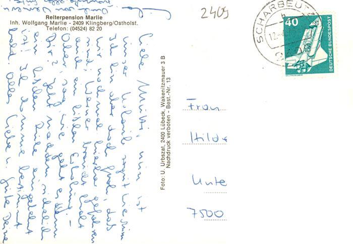 73940445 alte Postkarte Klingberg Reiterpension Marlie postalisch gelaufen Erhaltung siehe scans [FriedD77] KatCode: 11110001055044