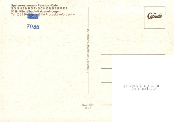 73152101 Klingelbach Katzeneinbogen Pension Cafe Restaurant Sonnenhof Schoenberger postalisch nicht gelaufen Erhaltung siehe scans [KathaD81] KatCode: 11110007141073