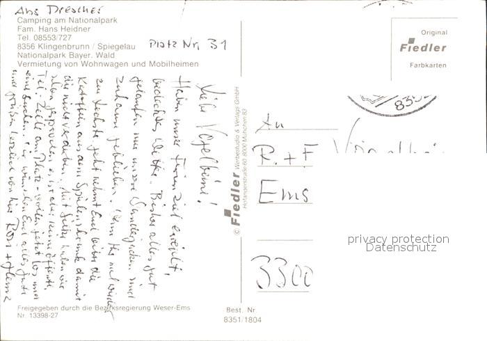 72307477 Klingenbrunn Camping am Nationalpark postalisch nicht gelaufen Erhaltung siehe scans KatCode: 11110009272149