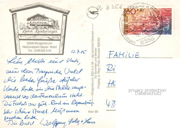 73860360 alte Postkarte Klingenbrunn Ort im Nationalpark Bayerischer Wald Hotel Hochriegel postalisch gelaufen Fliegeraufnahme Erhaltung siehe scans [FriedD77] KatCode: 11110009272149