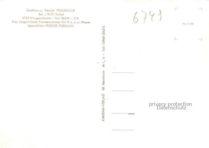 74043547 Klingenmuenster Weinstrasse Rheinland-Pfalz Gasthaus Pension Frauenlob Gastraum Kegelbahn Weinkellerei postalisch nicht gelaufen Erhaltung siehe scans [FriedD77] KatCode: 11110007337049