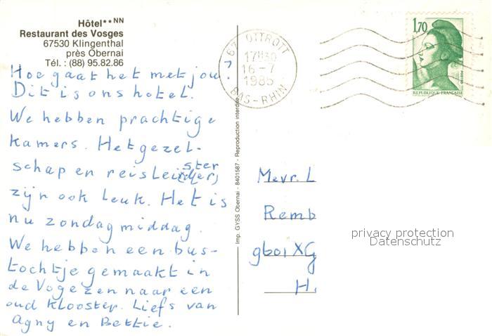 13747830 Klingenthal Bas Rhin Elsass Hotel Restaurant des Vosges postalisch gelaufen Erhaltung siehe scans [WerneD78] carte postale Wern Katcode 11170067867482