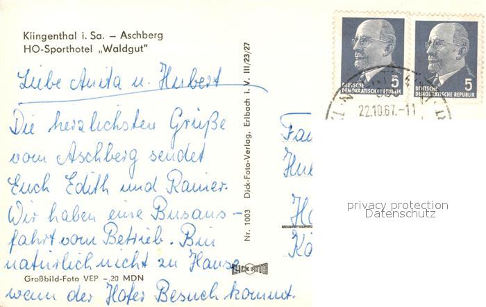 73292583 alte Postkarte Klingenthal Vogtland Aschberg HO Sporthotel Waldgut postalisch gelaufen Erhaltung siehe scans [WerneD78] KatCode: 11110014178250