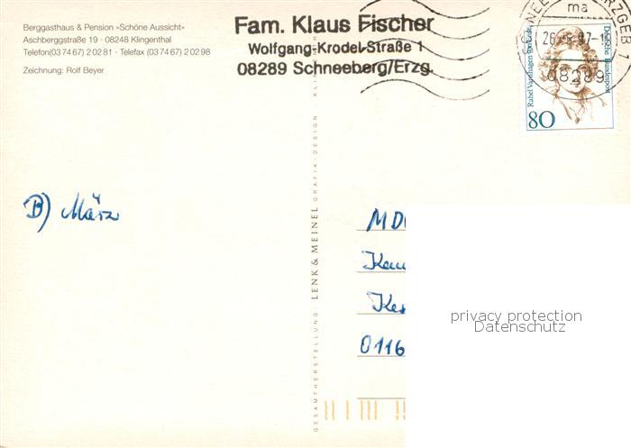 73755511 alte Postkarte Klingenthal Vogtland Berggasthaus Pension Schoene Aussicht Kuenstlerkarte postalisch gelaufen Erhaltung siehe scans [FriedD77] KatCode: 11110014178250