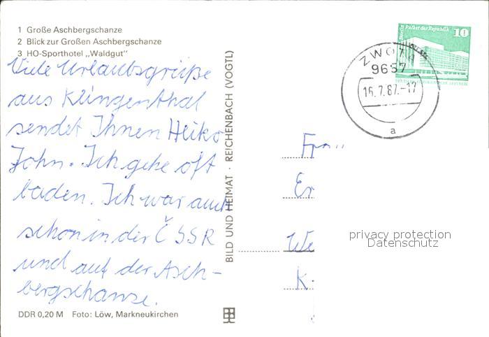 72335100 alte Postkarte Klingenthal Vogtland Gr Aschbergschanze Panorama HO Sporthotel Waldgut postalisch gelaufen Erhaltung siehe scans KatCode: 11110014178250