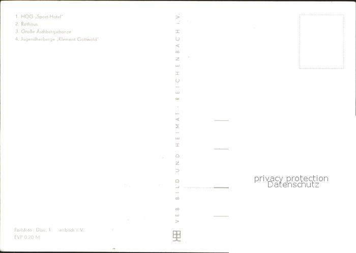 72059023 Klingenthal Vogtland HOG Sport Hotel Rathaus Grosse Aschbergschanze Jugendherberge Klement Gottwald postalisch nicht gelaufen Erhaltung siehe scans KatCode: 11110014178250