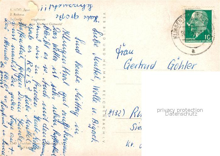 73065355 alte Postkarte Klingenthal Vogtland HOG Sporthotel Rathaus Skisprungschanze Jugendherberge Klement Gottwald postalisch gelaufen Erhaltung siehe scans [FriedD77] KatCode: 11110014178250