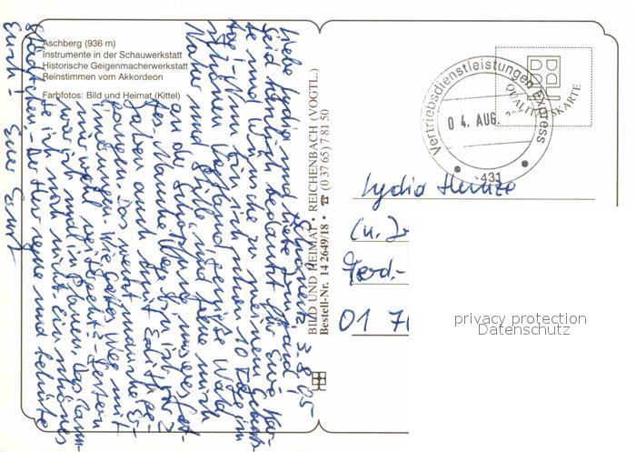72696697 alte Postkarte Klingenthal Vogtland Panorama Aschberg Baumbluete Musikinstrumente Schauwerkstatt Historische Geigenmacherwerkstatt Akkordeon postalisch gelaufen Erhaltung siehe scans [FriedD77] KatCode: 11110014178250