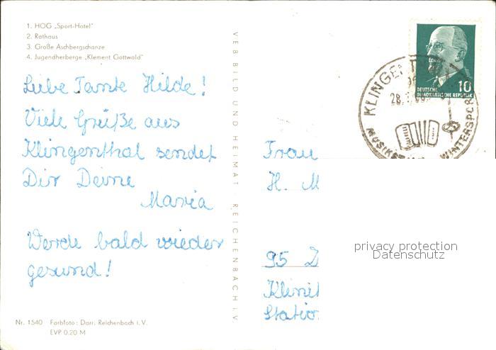 alte Postkarte Klingenthal Vogtland Sport-Hotel Grosse-Aschbergschanze Jugendherberge postalisch gelaufen Erhaltung siehe scans