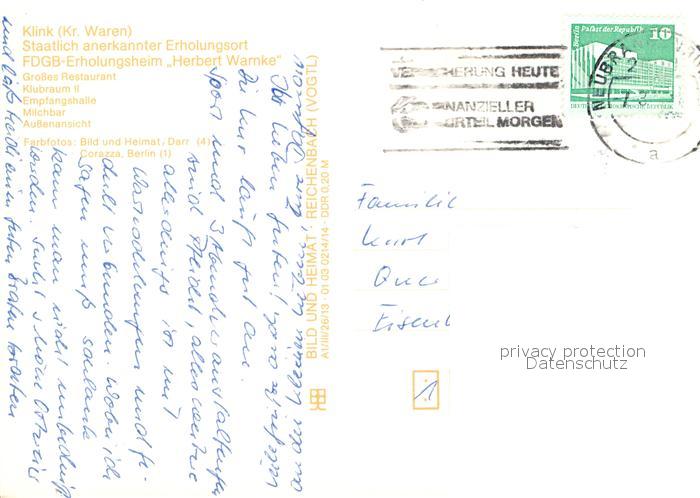 72946545 alte Postkarte Klink Waren Erholungsheim Herbert Warnke postalisch gelaufen Erhaltung siehe scans [LiesaD40] KatCode: 11110013056030