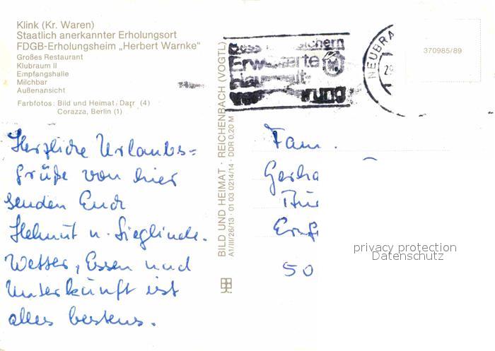 72742979 alte Postkarte Klink Waren Erholungsheim Herbert Warnke postalisch gelaufen Erhaltung siehe scans [LiesaD40] KatCode: 11110013056030