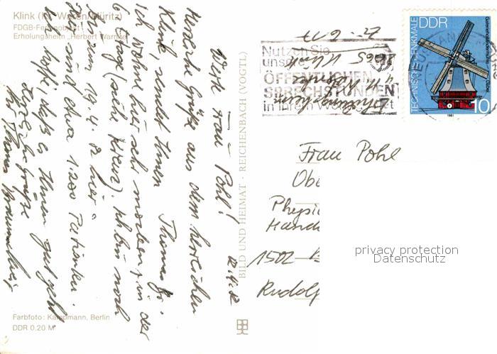 72655915 alte Postkarte Klink Waren Erholungsheim Herbert Warnke postalisch gelaufen Erhaltung siehe scans [LiesaD40] KatCode: 11110013056030
