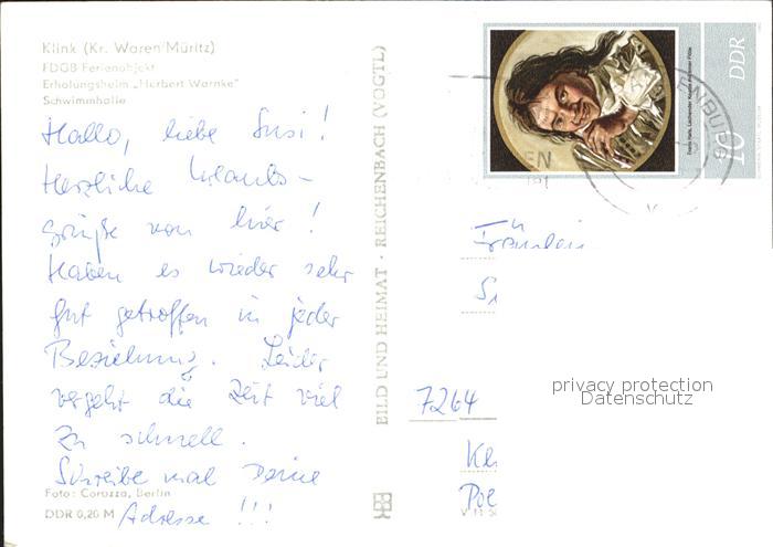 72077059 alte Postkarte Klink Waren Erholungsheim Herbert Warnke Schwimmhalle postalisch gelaufen Erhaltung siehe scans KatCode: 11110013056030