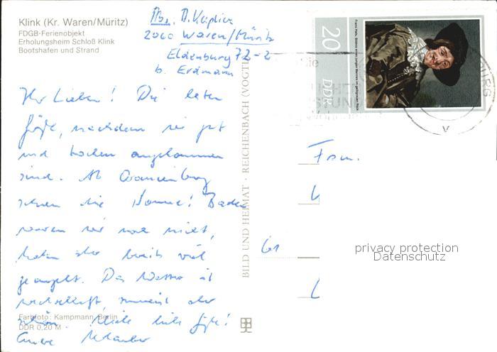 72467398 alte Postkarte Klink Waren Erholungsheim Schloss Klink Bootshafen und Strand postalisch gelaufen Erhaltung siehe scans KatCode: 11110013056030