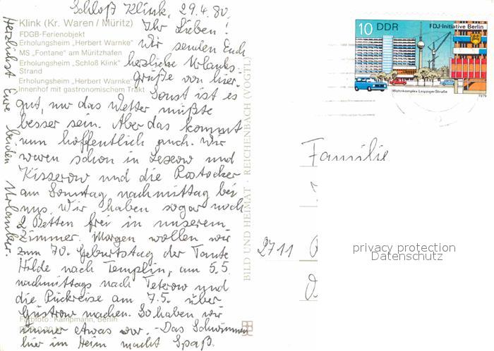 72630600 alte Postkarte Klink Waren Erholungsheime Herbert Warnke und Schloss Klink Mueritzhafen postalisch gelaufen Erhaltung siehe scans [LiesaD40] KatCode: 11110013056030
