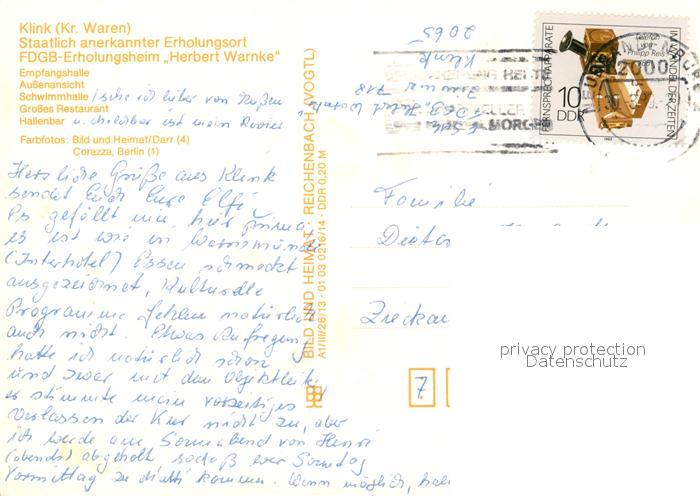 73167871 alte Postkarte Klink Waren FDGB-Erholungsheim Herbert Warnke postalisch gelaufen Erhaltung siehe scans [LiesaD40] KatCode: 11110013056030