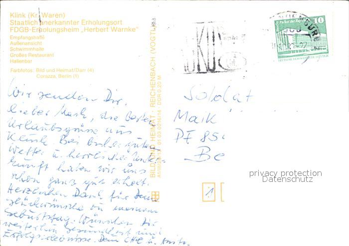 72067258 alte Postkarte Klink Waren FDGB Erholungsheim Herbert Warnke Empfangshalle Schwimmhalle Gr Restaurant Hallenbar postalisch gelaufen Erhaltung siehe scans KatCode: 11110013056030