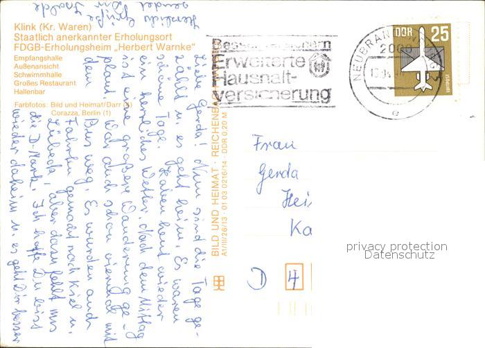 72479691 alte Postkarte Klink Waren FDGB Erholungsheim Herbert Warnke Empfangshalle Schwimmhalle Hallenbar postalisch gelaufen Erhaltung siehe scans KatCode: 11110013056030
