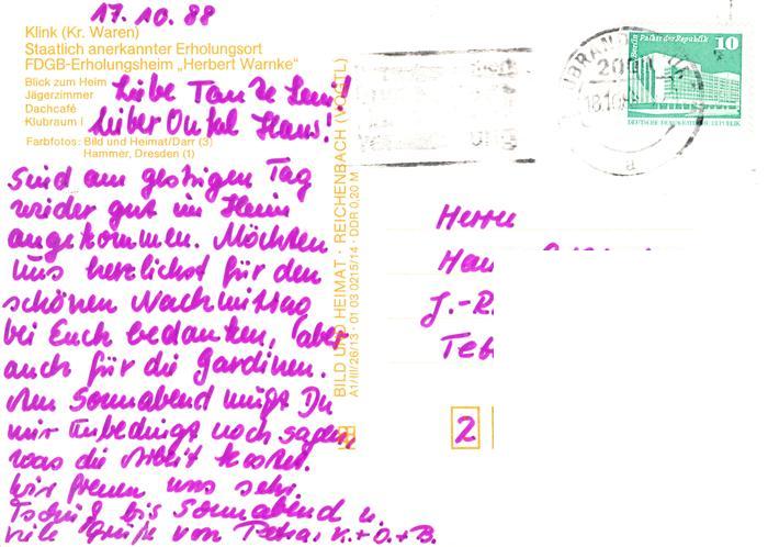 73882685 alte Postkarte Klink Waren FDGB Erholungsheim Herbert Warnke Heimblick Jaegerzimmer Dachcafe Klubraum postalisch gelaufen Erhaltung siehe scans [WerneD78] KatCode: 11110013056030