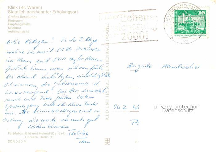 72726451 alte Postkarte Klink Waren FDGB Erholungsheim Herbert Warnke Restaurant Klubraum Empfangshalle Milchbar postalisch gelaufen Erhaltung siehe scans [FriedD77] KatCode: 11110013056030