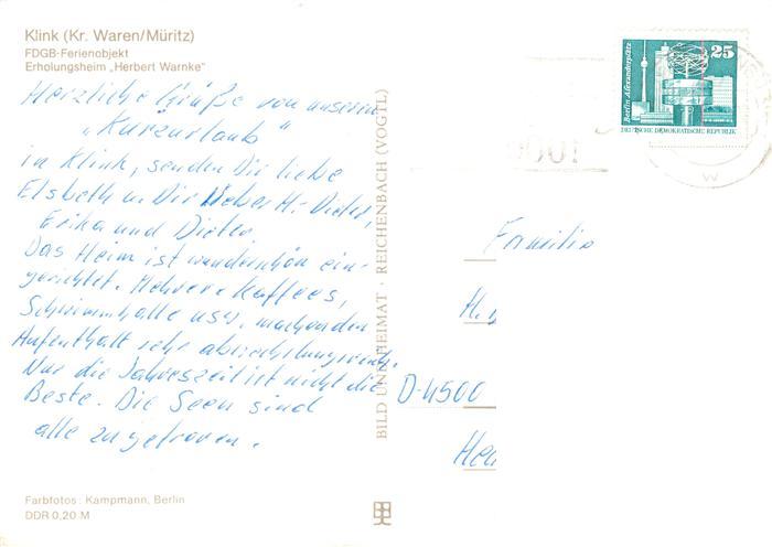 73908040 alte Postkarte Klink Waren FDGB Erholungsheim Herbert Warnke postalisch gelaufen Erhaltung siehe scans [WerneD78] KatCode: 11110013056030