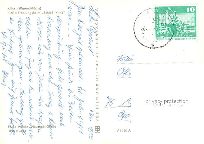 73753881 alte Postkarte Klink Waren FDGB Erholungsheim Schloss Klink postalisch gelaufen Erhaltung siehe scans [FriedD77] KatCode: 11110013056030