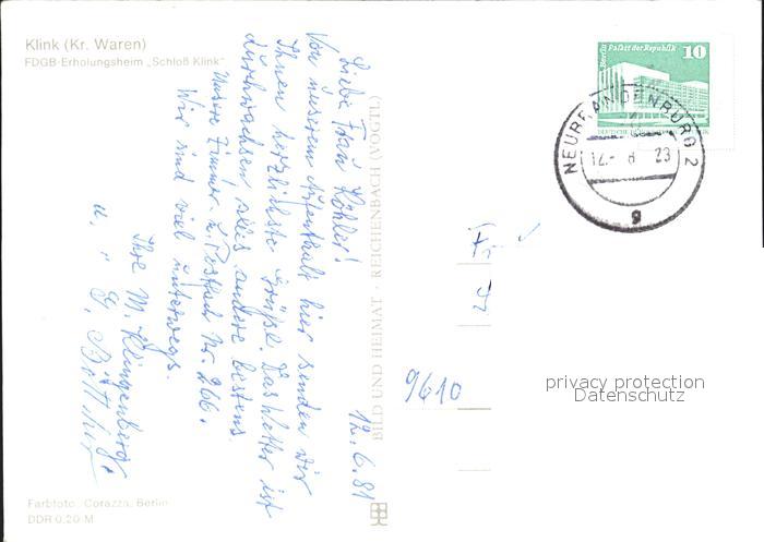 72331391 alte Postkarte Klink Waren FDGB-Erholungsheim Schloss Klink postalisch gelaufen Erhaltung siehe scans KatCode: 11110013056030