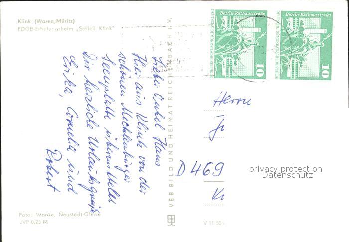 72040150 alte Postkarte Klink Waren FDGB Erholungsheim Schloss Klink postalisch gelaufen Erhaltung siehe scans KatCode: 11110013056030