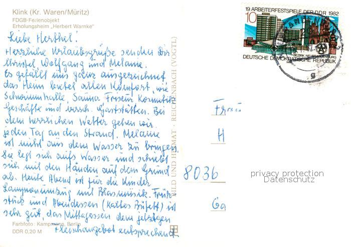 73157023 alte Postkarte Klink Waren FDGB Ferienheim Herbert Warnke postalisch gelaufen Erhaltung siehe scans [WerneD78] KatCode: 11110013056030