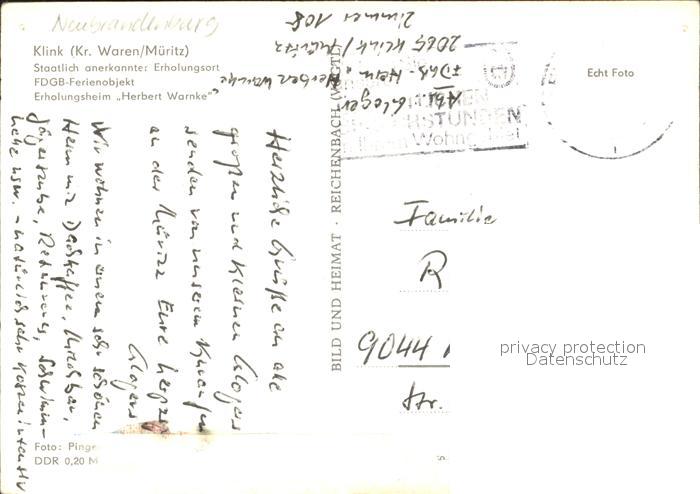 71989562 alte Postkarte Klink Waren FDGB Ferienobjekt Erhlunsheim Herbert Warnke postalisch gelaufen Erhaltung siehe scans KatCode: 11110013056030