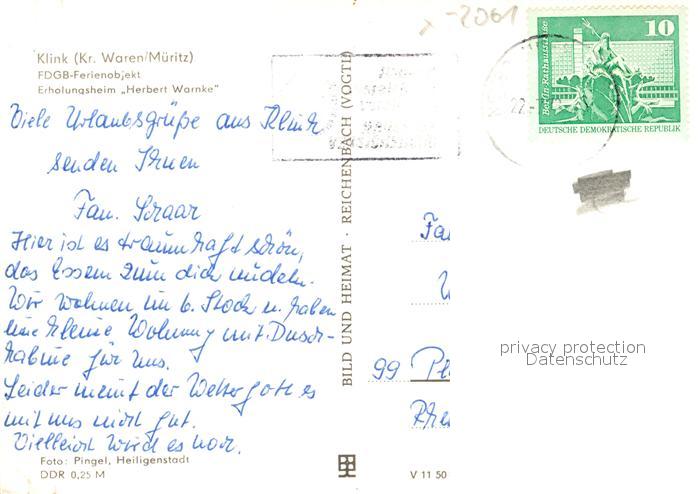 73036777 alte Postkarte Klink Waren FDGB Ferienobjekt Erholungsheim Herbert Warnke postalisch gelaufen Erhaltung siehe scans [KathaD81] KatCode: 11110013056030
