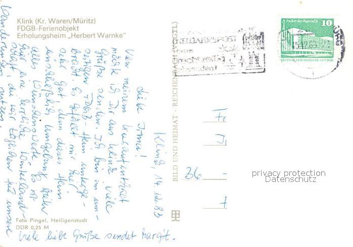 73027333 alte Postkarte Klink Waren FDGB Ferienobjekt Erholungsheim Herbert Warnke postalisch gelaufen Erhaltung siehe scans [KathaD81] KatCode: 11110013056030