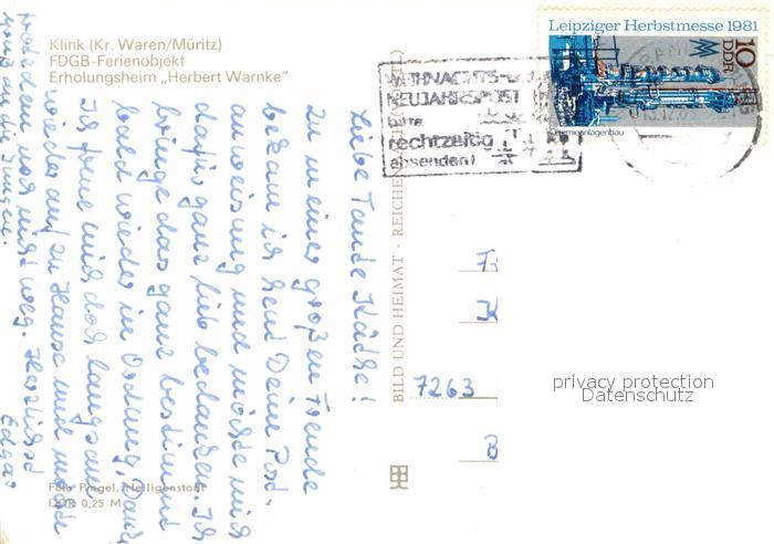 73741434 alte Postkarte Klink Waren FDGB-Ferienobjekt Erholungsheim Herbert Warnke postalisch gelaufen Erhaltung siehe scans [LiesaD40] KatCode: 11110013056030
