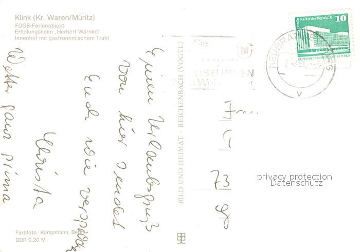 73652390 alte Postkarte Klink Waren FDGB Ferienobjekt Erholungsheim Herbert Warnke postalisch gelaufen Erhaltung siehe scans [FriedD77] KatCode: 11110013056030
