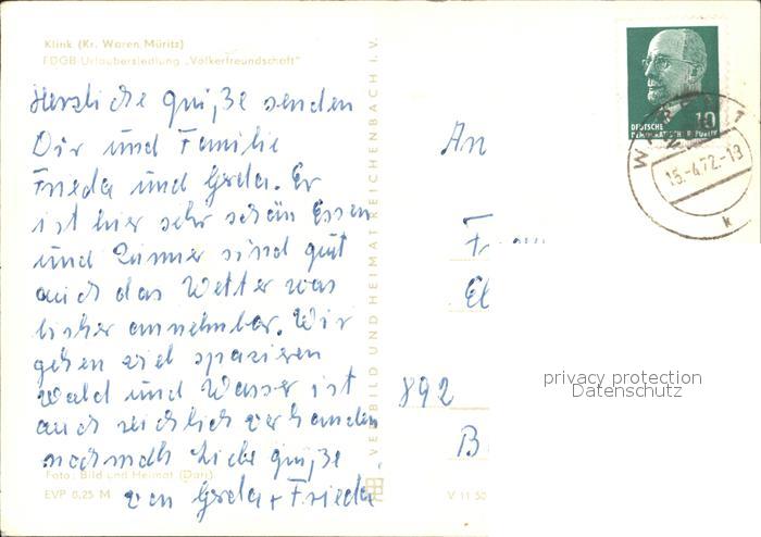 71980156 alte Postkarte Klink Waren FDGB Urlaubersiedlung Voelkerfreundschaft postalisch gelaufen Erhaltung siehe scans KatCode: 11110013056030