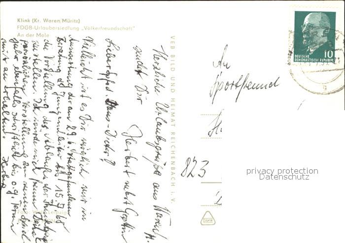 72115764 alte Postkarte Klink Waren FDGB- Urlaubersiedlung Voelkerfreundschaft An der Mole postalisch gelaufen Erhaltung siehe scans KatCode: 11110013056030