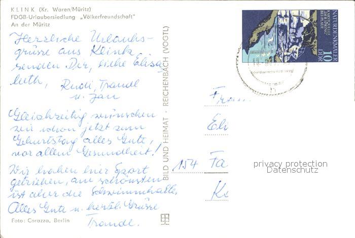 72120126 alte Postkarte Klink Waren FDGB Urlaubersiedlung Voelkerfreundschaft An der Mueritz postalisch gelaufen Erhaltung siehe scans KatCode: 11110013056030